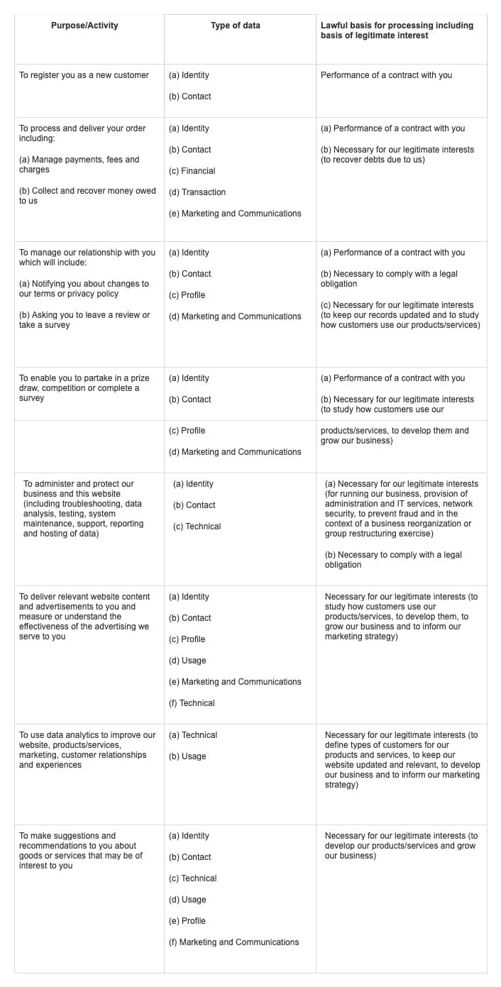 Note that we may process your personal data for more than one lawful ground depending on the specific purpose for which we are using your data. Please contact us if you need details about the specific legal ground we are relying on to process your personal data where more than one ground has been set out in the table below.